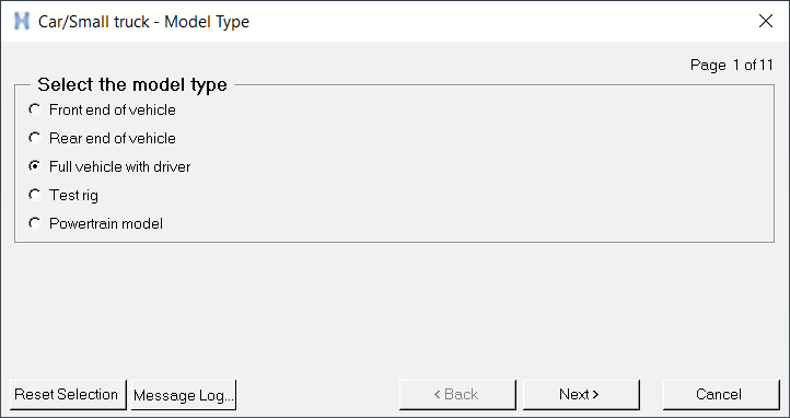 - Model TypeダイアログでFull vehicle with driverオプションを選択し、Nextをクリックします。