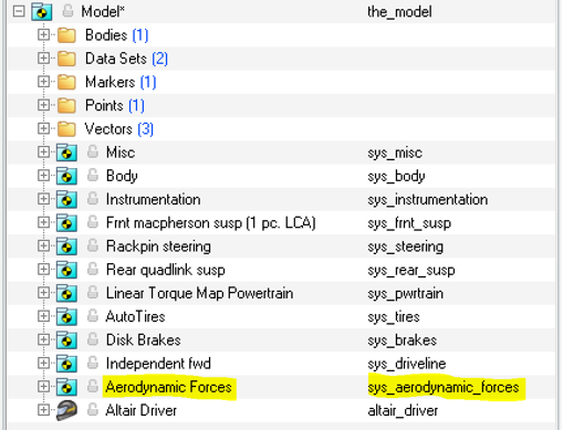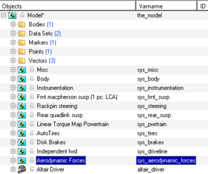 - Assembly Wizardでモデルを構築するために選択したAerodynamic Forcesを含むサブシステムがブラウザに表示されます。
