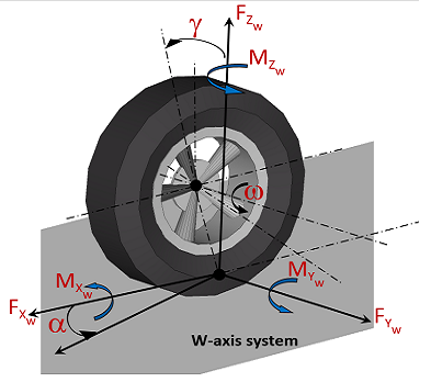 - “W”はホイールです。Tydex W軸座標系では、路面が平坦とは仮定せず、タイヤが路面と接触する位置で路面が示す局所的な傾斜が考慮されます。