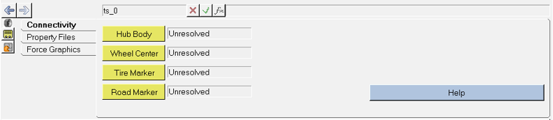 ConnectivityタブのHub Body、Wheel Center、Tire Marker、およびRoad Markerの各コレクターボタンを使用して、タイヤインターフェースを定義します。図 2.