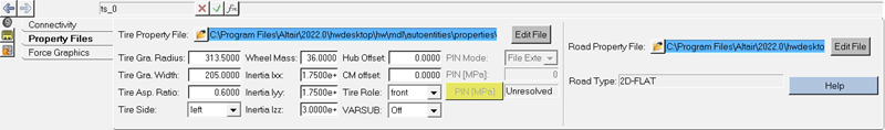 Property Filesタブには、Tire Property FileとRoad Property Fileの2つのセクションがあります。タイヤインターフェースでは、タイヤのパラメータとプロパティが拡張子が.tir/.tpf/.fxtのタイヤプロパティファイルによって設定されるのに対して、路面インターフェースでは拡張子が.rdf/.crg/.rgrの路面プロパティファイルによって記述されます。これらのプロパティファイルはどちらもTeimOrbitファイル形式です。AutoTire Propertiesタブのパラメータとそれらの意味について以下で説明します。
