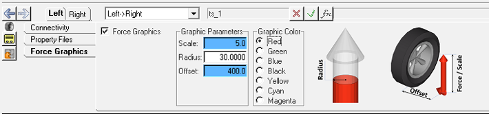 Offset | タイヤ接触パッチから外側へ向かってタイヤ力のグラフィックスを表示する位置までの距離(タイヤのセンターラインから横方向への距離)を示す実数を入力します。 |