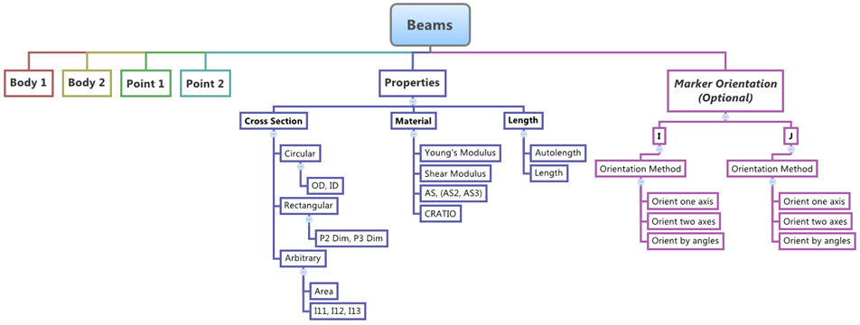ビームエンティティは、それぞれ異なる2つのボディ(Body 1とBody 2)に属している2つのポイント(Point 1とPoint 2)間に作用する、断面が均一で質量がゼロの直線状ビームを定義します。