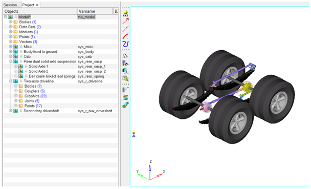 例えば、リアサスペンションとしてリアデュアルアクスルサスペンションを選択して、Rear end of truckセクションで2本のアクスルドライブラインを持つシステムを選択し、Assembly Wizardを使用してリアサスペンションモデルを構築します。構築したモデルが、次のようにグラフィックス領域に表示されます。図 1.