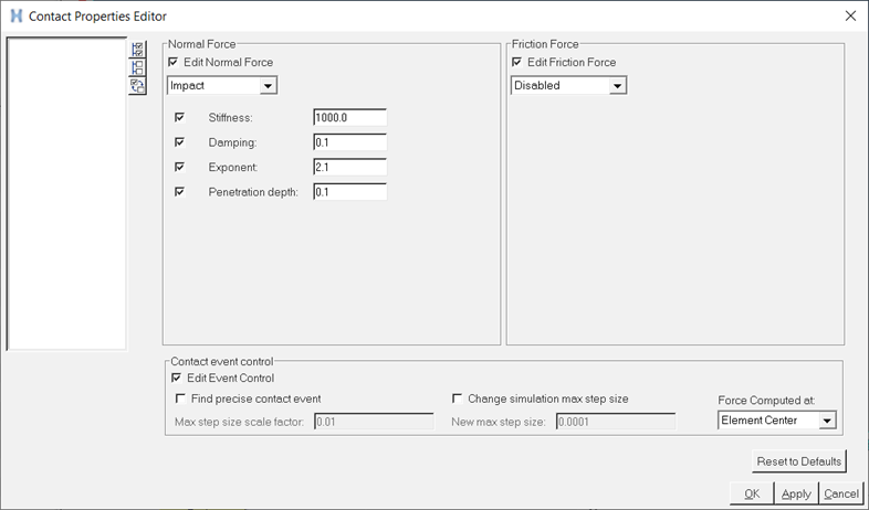 Contact Properties Editorマクロでは、モデルに適用される様々な接触力を編集することができます。
