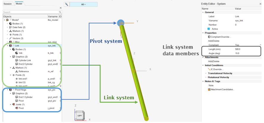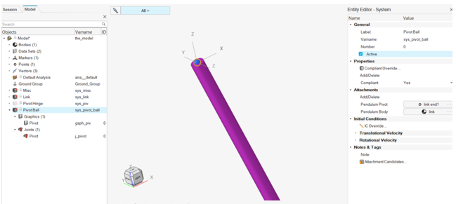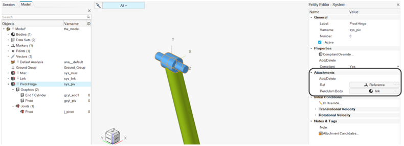 このシステムでは、リンクは、参照マーカーの原点において回転ジョイントを使用して拘束され、Z軸に沿った方向を向きます。リンクボディと参照マーカーは異なるシステム(リンク)内にあるため、モジュール性を維持するために、これらのエンティティはアタッチメントとしてPivot systemに入力されます。