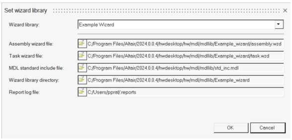 *Reportによって参照されているレポートテンプレートファイルもライブラリにコピーします。*Report内のパスがアナリシス定義ファイルを基準にしていることを確認してください。Example Wizardに関連付けられたファイルは、~install\hwdesktop\hw\mdl\mdllib\Example_wizardにあります。