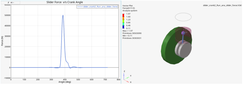 6. レポート - このレポートは、クランク角度に応じてピストンにかかる力をプロットし、その横にはアニメーションを表示します。