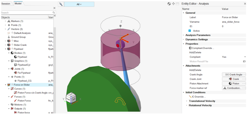 1. アタッチメント - Crank Angle(ソルバー変数)、Crank Joint(ジョイント)、Piston Attachment(ボディ)、Force marker ref(マーカー)。