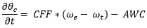 クラッチを切り離してから再び接続すると、一部のクラッチスリップがクラッチ内に残り、切り離してもクラッチスリップが0以外の値で保持されます。ただし、実際のシミュレーションでは、切り離されている間プレートはフリーとなり、切り離し後の有限時間()内にクラッチスリップは0に戻ります。これをシステム内でモデル化する必要があります。そのため、クラッチスリップを0に戻すAWCコンポーネントがクラッチスリップの導関数に組み込まれています。