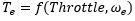エンジンは、現在のスロットル位置(入力)とエンジンスピード(状態)に基づいてトルクを生成するブラックボックスとしてモデル化されます。エンジンのすべての回転コンポーネントの回転慣性は、一括してで表現されます。エンジンの回転コンポーネントを加速するためのトルクは、エンジンが生成するトルクとクラッチによる反作用トルクの差です。したがって、エンジン状態(スピード)の導関数は次のように与えられます: