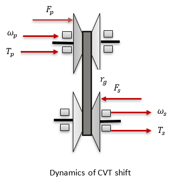 シフト比を計算するには、CMMモデルを使用します。CMMモデルに従って、プライマリプーリーとセカンダリプーリーのクランプ力比が静止クランプ力比と同じでない場合、バリエーターのベルトが移動します。静止クランプ力とは、ベルトが平衡を保ち移動することのないクランプ力の比です。