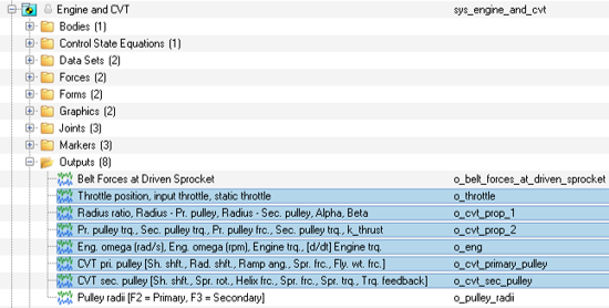 CVTパワートレインは、Control State Equation(CSE)によって記述されます。パワートレインへの入力は、スロットルと変速機入力シャフト速度です。出力はセカンダリプーリーのトルクです。オプションで、パワートレインへの2つのクランプ力の入力があります。CVTプロパティファイルにより、機械的CVTまたは電動 / 油圧CVT間の選択が可能になります。デフォルトでは、MSは機械的CVTをモデル化し、クランプ力はCVTプロパティファイル内のパラメータに基づいて計算されます。