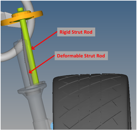 可変式ストラットシステムでは、ストラットロッドはビームによってモデル化され、ストラットチューブとのストラットロッドジョイントは点-可変形曲線拘束によってモデル化されます。これにより、ストラットは荷重下で曲げ変形し、ストラットサスペンションに共通する横力によるキャンバーの変化を捕捉できます。