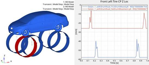 車両モデル内のタイヤごとにドラム路面ファイルを受け取ることができます。このアプローチを使用すれば、特定のドラムに別の運動や路面の不規則性を指定することができます。