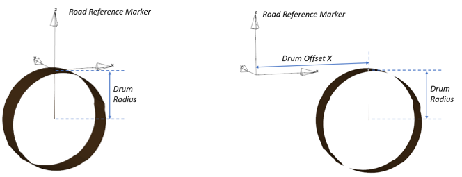 ドラムは、路面ファイル.rdfでオフセットオプションを使用することによって、異なる位置に配置できます。このオプションを使用すると、ドラム路面が路面参照マーカーを参照します。