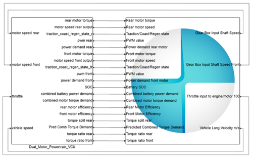 このパワートレインのTwin Activateアーキテクチャは、主にDual MotorVehicle Control Unit(VCU)という2つのメインスーパーブロックに分割されます。VCUの役割は、ドライバのスロットルからの入力を受け取ること、および車両の現在状態を監視することです。VCUはこの情報に基づいて、車両内のトルク配分と、各モーターのトルクの利用方法を決定します。デュアルモーターはVCUから出力を受け取り、適切なパルス幅変調(PWM)値を計算してモーターを制御します。また、各モーターのトルク出力を決定し、電力需要を評価し、最後に、車両バッテリーの充電状態(SOC)レベルを追跡します。