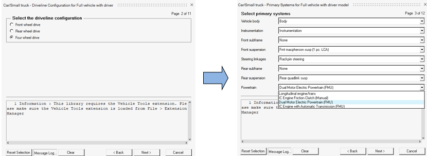 4. Four wheel driveのドライブライン構成を選択してから、PowertrainドロップダウンメニューにあるDual Motor Electric Powertrain (FMU)を選択します。