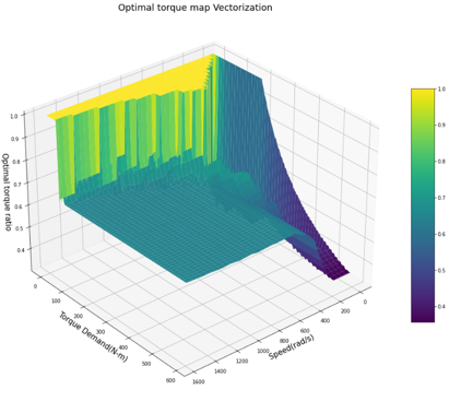 下の図は、デフォルトのモーター構成の最適トルク比を含む3Dマップを示しています。このマップは、.efmpファイルによって提供されるモーターデータに基づいて、それぞれのシミュレーション前に自動的に生成されます。
