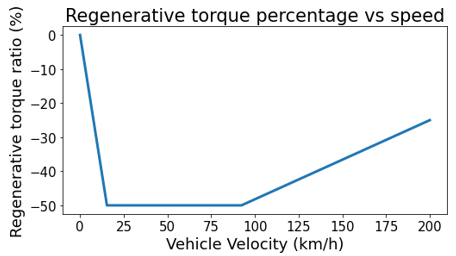 上図で、pcuより上の領域はトラクション領域で、下の境界(pcl)より下の領域は回生領域です。これらの境界間の惰行帯は車両速度と共に増加します。この拡大は、車両速度が速いときにアクセルペダルの感度を下げることを目的とした意図的な設計上の選択です。パワートレイン内の回生トルクは、通常のトラフィック状態での車両を制動するために使用できます。モーターは、都市での運転で1つのペダルだけを使用して車両を操作するのに十分な負のトルクを提供します1。 車両速度が速い場合は、回生トルクだけでは車両を停止させるのに十分ではないため、摩擦制動を使用する必要があります。このモデル内の回生トルク比率は、下の図に示すように、車両速度に伴って変化します。