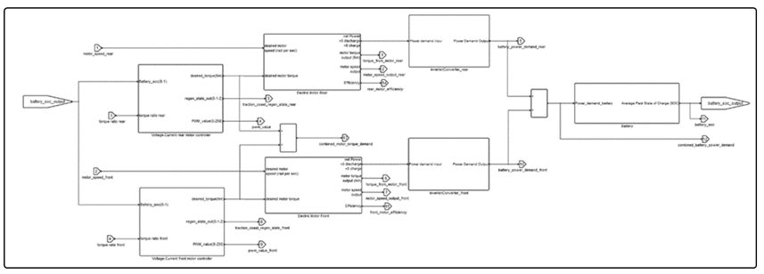 電圧-電流コントローラーブロックは、モーターに供給されるACの制御に使用されます。制御電圧は、車両速度、モーター速度、アクセルペダル入力、およびバッテリー充電状態によって異なります。モーターに加える適切な電圧を決定するために、このコントローラーはパルス幅変調(PWM)を使用し、トルクのルックアップテーブルを参照します。さらに、電圧は、バッテリーの充電状態(SOC)によって課される制約を受けます。特に、バッテリーのSOCが80%を超えると、コントローラーは回生制動を禁止することで、バッテリーセルの整合性が損なわれないようにします。このような制動は損傷をもたらす可能性があるためです。逆に、バッテリーのSOCが20%を下回った場合も、同じくバッテリーセルの保護措置として、バッテリーは電流を供給しなくなります。
