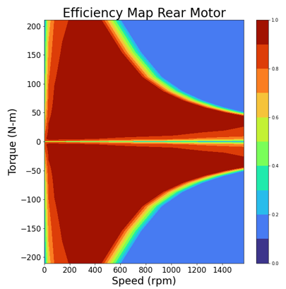 • デフォルトのモーター構成では、効率マッピングの点においては、モーターの回生領域はトラクション領域と同じであると想定されています。