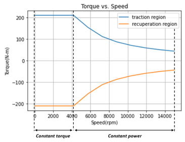 トルク-速度特性曲線は、下の図に示すように、モーターのトラクション(正)領域と回生制動(負)領域の両方のトルク境界を示すため、特に重要です。これらの境界は、モーターが生成できる最大の正 / 負のトルクを表します。PMSMモーターの特性には、定トルク領域と定出力領域という2つの領域が含まれます。モーターは定格速度まで最大トルクを提供し、その後は、最大出力を提供できます。