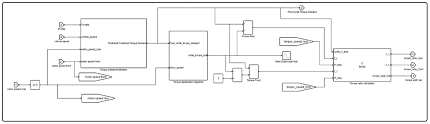 車両制御ユニットブロックは、トルク需要推定、トルク分配アルゴリズム、トルク比計算で構成されています。