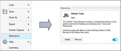 - Loadボタンを右側にスライドして、Vehicle Tools拡張機能を読み込みます。MotionViewにVehicle Toolsページが追加されます。
