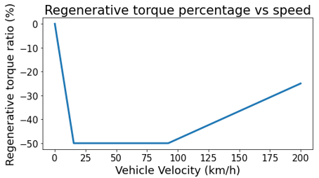 関連するパラメータを操作することで、車両の回生制動量を決定することもできます。回生制動量を求める式は、1によって得られます。 回生制動の配分率は、デフォルトでは60-40(フロント-リア)に固定されています。モーターのトラクション、惰行、回生の各領域のマッピングは、1で詳述されています。 車両の惰行境界‘ ’および‘ ’は、パラメータ‘ ’,’、‘ ’、‘ ’、および車両の最大速度‘ ’によって定義されます。車両の速度別の回生量は、ルックアップテーブルとして使用されるマップによって決定されます。‘ ’と‘ ’は、速度と回生制動のマッピングのためのパラメータです。最後に、‘ ’は、スロットルと出力トルク間の相関関係の定義に使用されます。
