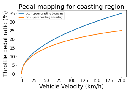上図で、pcuより上の領域はトラクション領域で、下の境界(pcl)より下の領域は回生領域です。これらの境界間の惰行帯は車両速度と共に増加します。この拡大は、車両速度が速いときにアクセルペダルの感度を下げることを目的とした意図的な設計上の選択です。