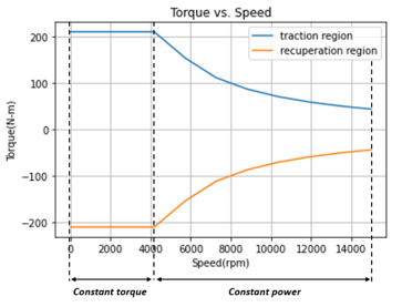 - 永久磁石同期モーター(PMSM)の包括的なモデルは、その速度-トルク特性と効率データに基づいて構築されます。この情報は、モーターのトルク-速度特性曲線とトルク-速度-効率特性曲線を含む外部効率マップファイル(.efmp)から得られます。このデータは、適切な変数を含む.matファイルの形式でルックアップテーブルを通じて明示的に取得されます。この手法では、ユーザー定義の電気モーターデータを車両シミュレーションに取り込むことができ、消費電力の正確な計算が保証されます。トルク-速度特性曲線は、下の図に示すように、モーターのトラクション(正)領域と回生制動(負)領域の両方のトルク境界を示すため、特に重要です。これらの境界は、対応する速度においてモーターが生成できる最大の正 / 負トルクを表します。PMSMモーターの特性には、定トルク領域と定出力領域という2つの領域が含まれます。モーターは定格速度まで最大トルクを提供し、その後は、最大出力を提供できます。
