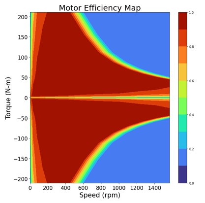 - デフォルトのモーター構成では、効率マッピングの点においては、モーターの回生領域はトラクション領域と同じであると想定されています。