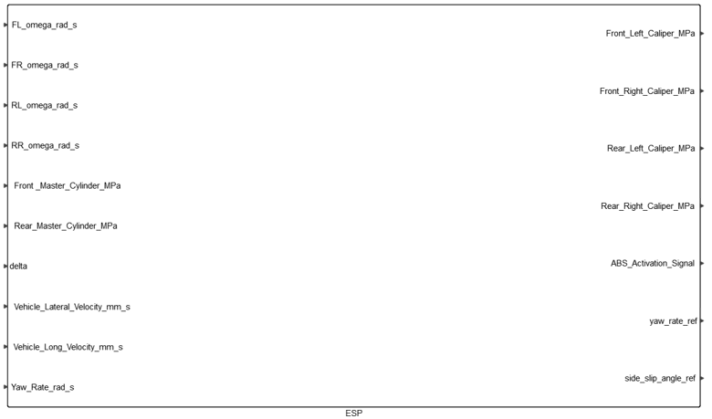 一部の信号はセンサーからの信号(ホイール速度、車両の縦速度と横速度、ステアリング角、ヨーレート)を表しますが、他の信号はMotionViewの油圧パートからTwin Activateの油圧パートに接続されています(マスターシリンダー圧力)。車両速度は、通常、測定ではなく推定されます。現在の実装では、制御システムの挙動に焦点を当てるために、これらの値がMBS車両モデルの出力として使用されています。