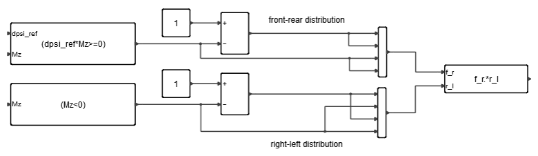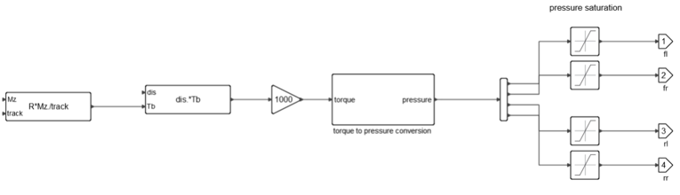 目的の車両のヨーモーメントは、油圧モジュレータから生成される目的のキャリパー圧で表される必要があります。ヨーモーメントは、まず、適切なトラック幅(前または後ろ)を使用することによって、タイヤの縦力で表されます。次に、タイヤの半径を使用した制動トルク、最後に、ブレーキシステムパラメータを使用した制動圧で表されます。Twin Activate内の実装を以下に示します:図 9. Twin Activate内のブレーキ圧に対するヨーモーメント