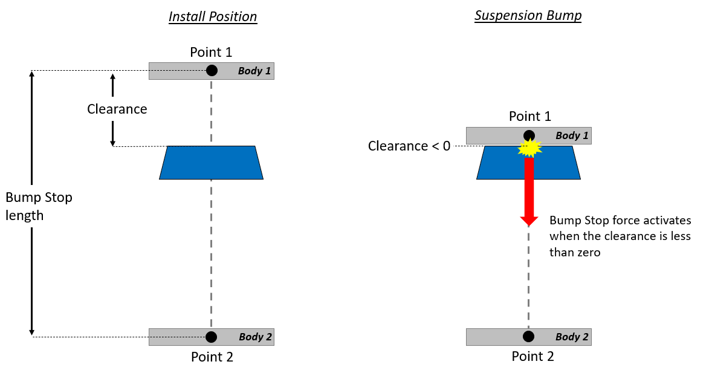 Clearance手法を使用すると、Body 1とBody 2の間の距離が、Bump Stop LengthからClearance値を差し引いたものより短い場合(つまり、クリアランスがゼロより小さい値に達した場合)にBump Stopフォースがアクティブになります。