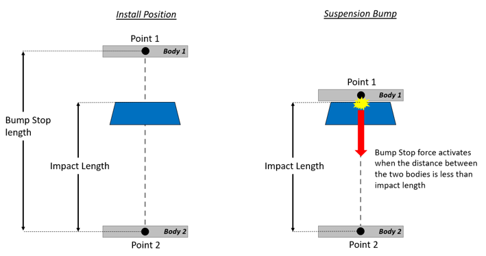 Body 1とBody 2の間の距離がImpact Lengthよりも短い場合、Bump Stopフォースが作用します。Impact Length導入手法を使用している場合は、その値を直接使用して、2つのボディ間のBump Stopフォースがアクティブになります。