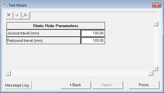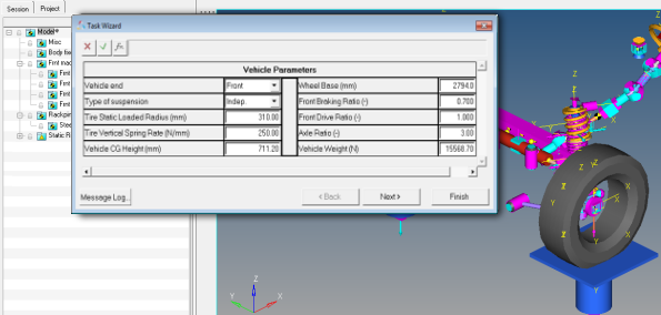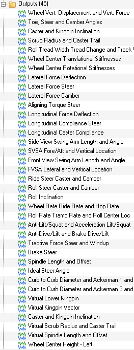 このイベントでサスペンション設計係数が作成されます。これらの係数はサスペンションの性能を評価する際に使用します。それらは、解析対象のサスペンションのトポロジに適合するように自動的に作成されます。図 8.