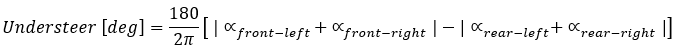 アンダーステアは、フロントタイヤとリアタイヤの平均スリップ角の差です。ニュートラルステアの車両では、フロントタイヤとリアタイヤでスリップ角が同じになります。アンダーステアの車両では、フロントのスリップ角の方がリアのスリップ角より大きくなり、オーバーステアの車両では、リアのスリップ角の方がフロントのスリップ角より大きくなります。