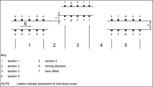 このイベントは、ISOイベント3888-2”Passenger cars-Test track for a severe lane change maneuver-Part 2: Obstacle avoidance”に似ています。このISOイベントは、車線およびコーンのテストトラック設定を定義します。車線幅は車両幅の役目を果たし、コーンが乱れなければ、どのような経路でも走行可能です。このISOイベントの経路を以下に示します。