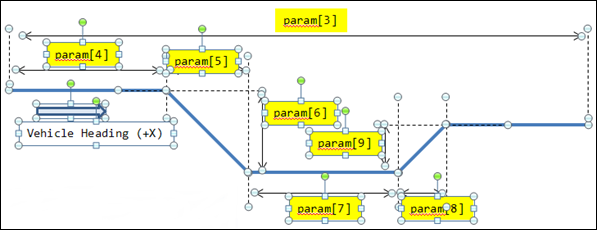 Double Lane Change eventには13個のマーカーがあります。経路の原点は、すべてのレーンチェンジグラフィックスの原点で、車体のCGになるようにパラメータで定義されます。マーカーはポイントを指し示し、ポイントにはパラメータのロジックが含まれます。