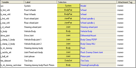 Single lane changeイベントには、球ジョイントが1つ組み込まれています。このジョイントは、ダミーボディをステアリングラックに結合します。このジョイントは、特定のイベントをADAMSで機能させるために含まれています。モデルを手動で構築する場合は、ダミーボディをステアリングラックに結合します。