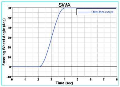 このイベントでは、車両は定常状態に到達するまでの2秒間、初期速度の55mphで直進します。2~4秒の間に、イベントフォームで選択した関数(sine、step、またはramp)を使用して、車両では0から規定の値(デフォルトは60度)までハンドルが操作されます。4秒後からシミュレーションの終了まで、ハンドルは同じ角度またはトルクで固定されたままです。