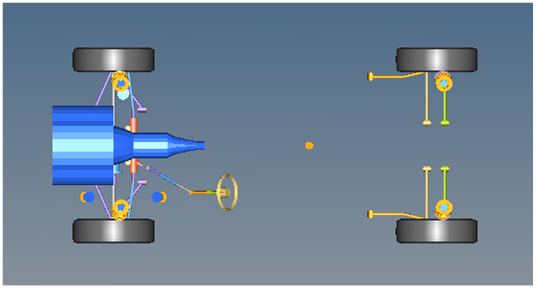 Step Steer eventにはボールジョイントが1つあります。このジョイントは、ダミーボディをステアリングラックに結合します。特定のイベントがADAMSで機能できるように、このジョイントが用意されています。モデルを手動で構築する場合は、ダミーボディをステアリングラックに結合します。