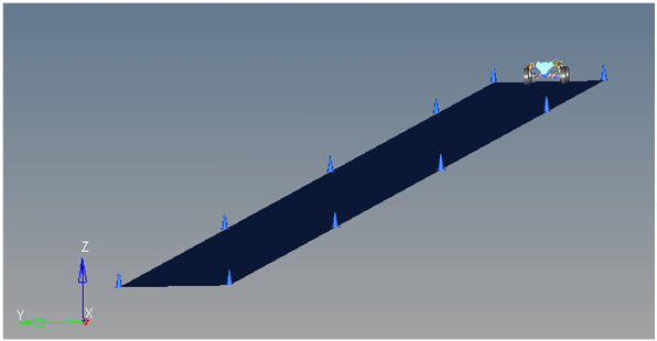道路のグラフィックスは、走行する経路を示すために組み込まれて、Straight line acceleration Form内のデータを使用してパラメータで定義されています。道路のグラフィックスはすべて車線の寸法を示すために使用されますが、これらは実際の道路のものではなく、タイヤ力を計算するために使用されます。道路のグラフィックスは、イベントが根本的に変更されないかぎり、編集する必要はありません。