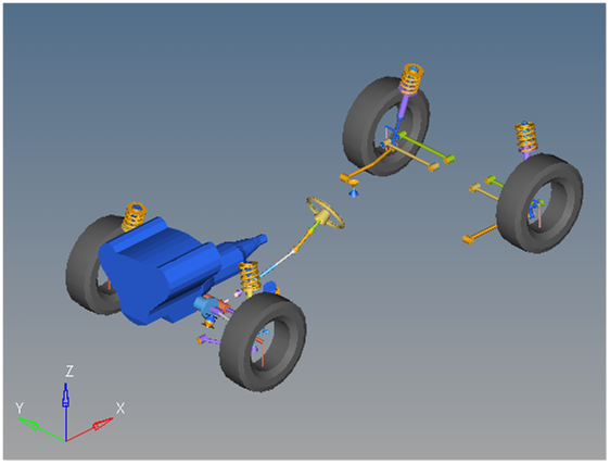3つのモーションがイベントに組み込まれています。ステアリングモーションはハンドルのモーションを定義し、ハンドルを車体に接合する回転ジョイントに作用します。ステアリングコラムがモデルに含まれない場合、モーションがステアリングラックのインプットシャフトと車体の間のジョイントに作用します。