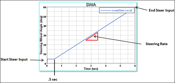 このイベントでは、車両は初期速度の40mphで直進し、0.5秒後、定常状態に到達します。この時点から、ステアリングホイール角は5度増大し、最大値が60度に到達するまで、1秒ごとにステアリングホイール角が10度ずつ増大します。