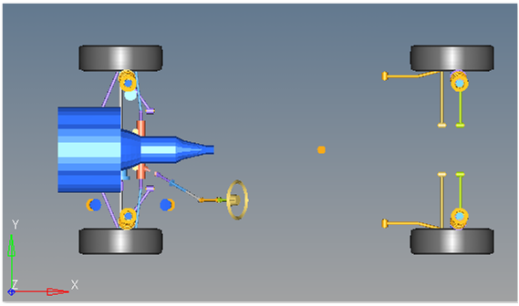 Swept steerイベントには球ジョイントが1つ組み込まれています。ジョイントは、ダミーボディをステアリングラックに付加します。ジョイントは、特定のイベントをADAMSで動作させるために含まれています。モデルを手動で構築する場合にダミーボディをステアリングラックに付加します。