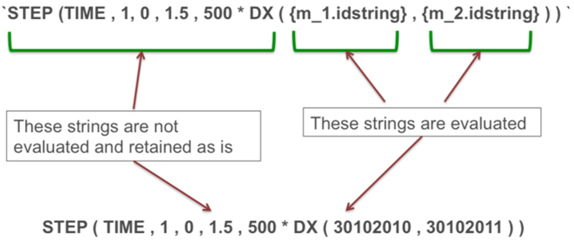 ``)で囲んで記述します。 - ソルバー関数内部のパラメトリックな式は中括弧({})で囲まれます。バッククォーテーションで囲まれたソルバー関数がMotionViewによって検出されると、ソルバー入力ファイル(MotionSolveの.xmlファイル)にモデルがエクスポートされる際に、中括弧で囲まれたすべてのパラメトリックな式がTemplexパーサーによって評価されます。つまり、中括弧で囲まれたTemplex演算子、関数、および変数名ではなく、評価されたパラメトリックな式がソルバー入力ファイルに書き込まれます。