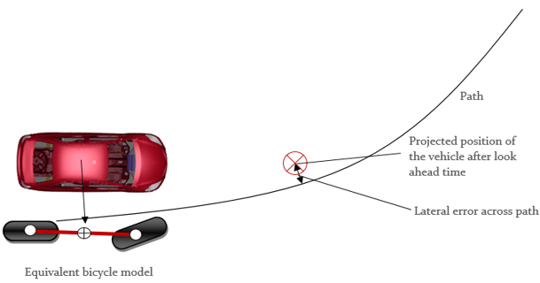 フィードフォワードスロットルコントローラーやブレーキコントローラーと同様に、ステアリングフィードフォワードコントローラーは、先読み時間後または先読み距離後の車両の状態を予測します。予測点と定義された経路を用いて、ステアリング角度を与えることで横方向の誤差の最小化を試みます。